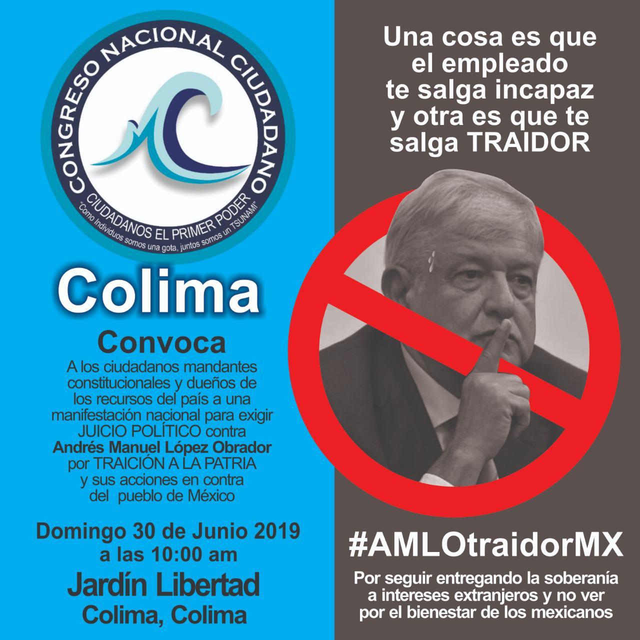 Colima, México, Avanzada (26/06/2019).- Integrantes del Consejo Nacional Ciudadano (CONACI) convocaron a una marcha en contra del presidente Andrés Manuel López Obrador por permitir la entrada...