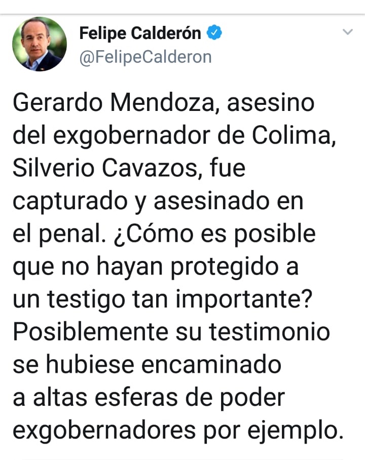 Colima, México, Avanzada (14/05/2018).- El expresidente Felipe Calderón Hinojosa insinuó que el asesinato de Gerardo Mendoza –presunto autor intelectual del homicidio del exgobernador Silverio Cavazos–, podría...