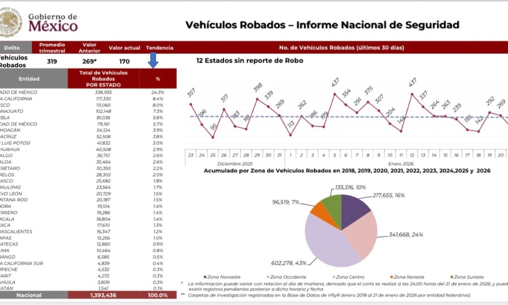 Colima, México, Avanzada (22/01/2026).- Entre 2018 y enero de 2026, en Colima se han robado 10 mil 464 vehículos, de acuerdo con registros del programa Vehículos...