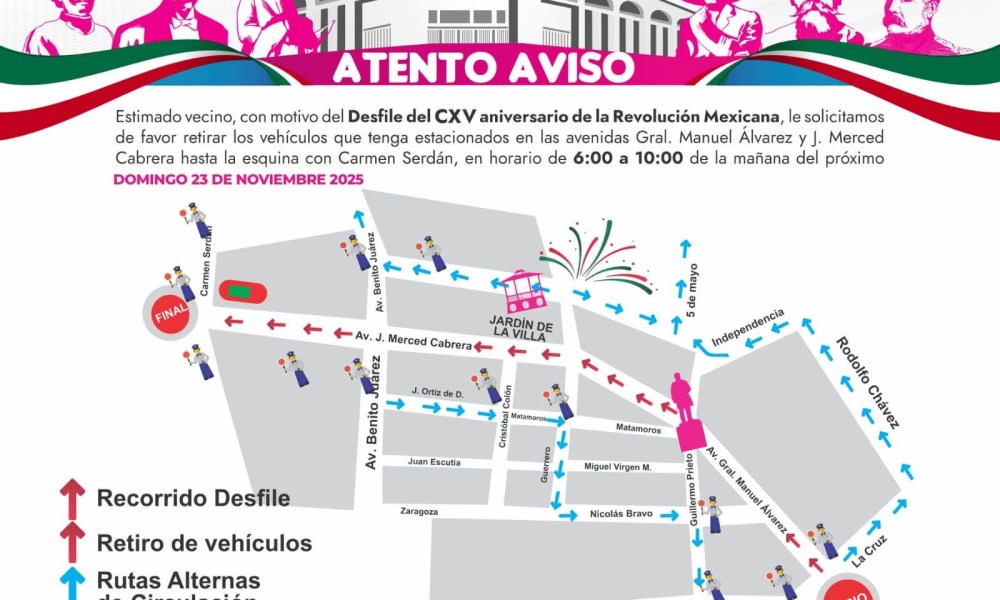 De 6:00 am a 10:00 am etarán cerradas a la vialidad las avenidas General Manuel Álvarez y J. Merced CabreraVilla de Álvarez, Colima, Comunicado (22/11/2025).- Para...