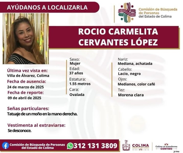 Colima, México, Avanzada (10/04/2025).- La Comisión de Búsqueda de Personas del Estado de Colima emitió una ficha para localizar a Rocío Carmelita Cervantes López, mujer de...
