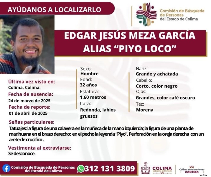Colima, México, Avanzada (06/04/2025).- La Comisión de Búsqueda de Personas del Estado de Colima ha emitido una alerta para localizar a Edgar Jesús Meza García, conocido...