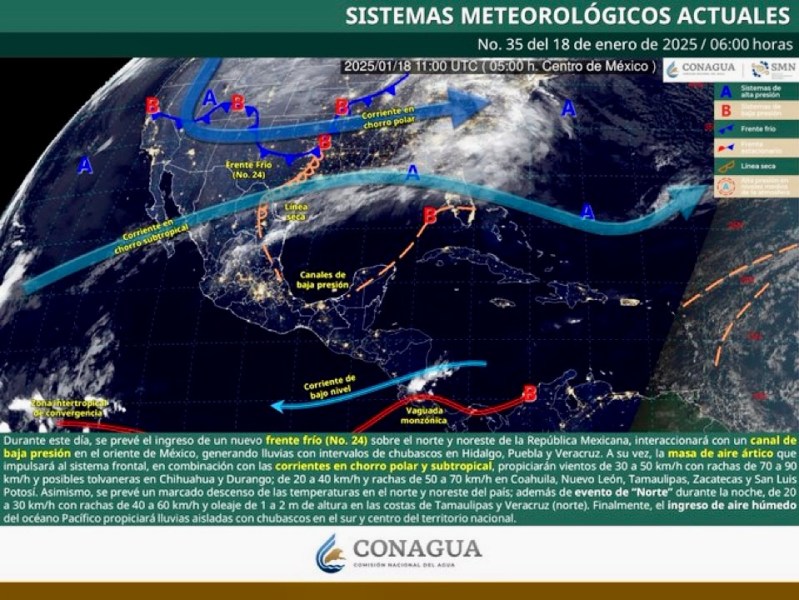 Colima, México, Avanzada (18/01/2025).- Este sábado 18 de enero, Colima se mantendrá al margen de los efectos directos del frente frío No. 24, que impactará principalmente...