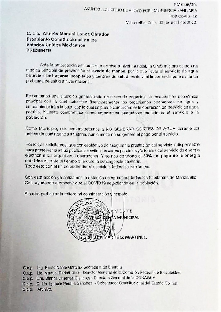 Manzanillo, México, Comunicado (20/04/2020).- Para beneficio de todas las familias de Manzanillo, del Estado de Colima y del país, la Presidenta Municipal, Griselda Martínez Martínez, envió...