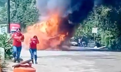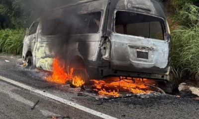 Colima, México, Avanzada (05/10/2025).- Una camioneta tipo van de color blanco se incendió este domingo sobre la carretera rumbo a Melaque, a la altura de El...