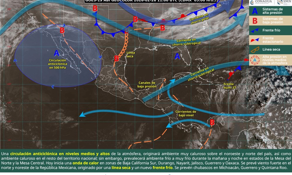 Colima, México, Avanzada (26/02/2026).- Una circulación anticiclónica en niveles medios y altos de la atmósfera mantendrá este miércoles ambiente estable y caluroso en gran parte del...