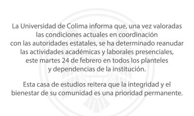 Colima, México, Avanzada (23/02/2026).- La Universidad de Colima informó que, tras valorar las condiciones actuales en coordinación con autoridades estatales, se determinó reanudar las actividades académicas...