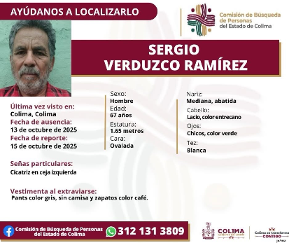 Colima, México, Avanzada (16/10/2025).- La Comisión de Búsqueda de Personas del Estado de Colima emitió una ficha para localizar a Sergio Verduzco Ramírez, de 67 años...