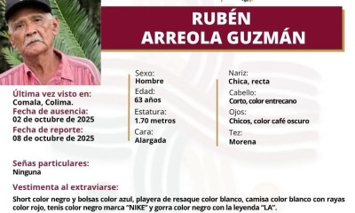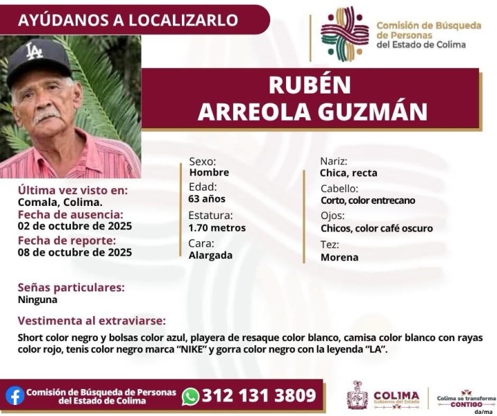 Colima, México, Avanzada (11/10/2025).- La Comisión de Búsqueda de Personas del Estado de Colima emitió una ficha para localizar a Rubén Arreola Guzmán, de 63 años...