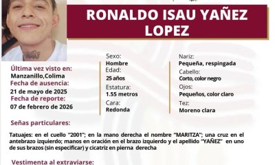 Colima, México, Avanzada (07/02/2026).- La Comisión de Búsqueda de Personas del Estado de Colima activó una ficha de localización para Ronaldo Isau Yáñez López, de 25...