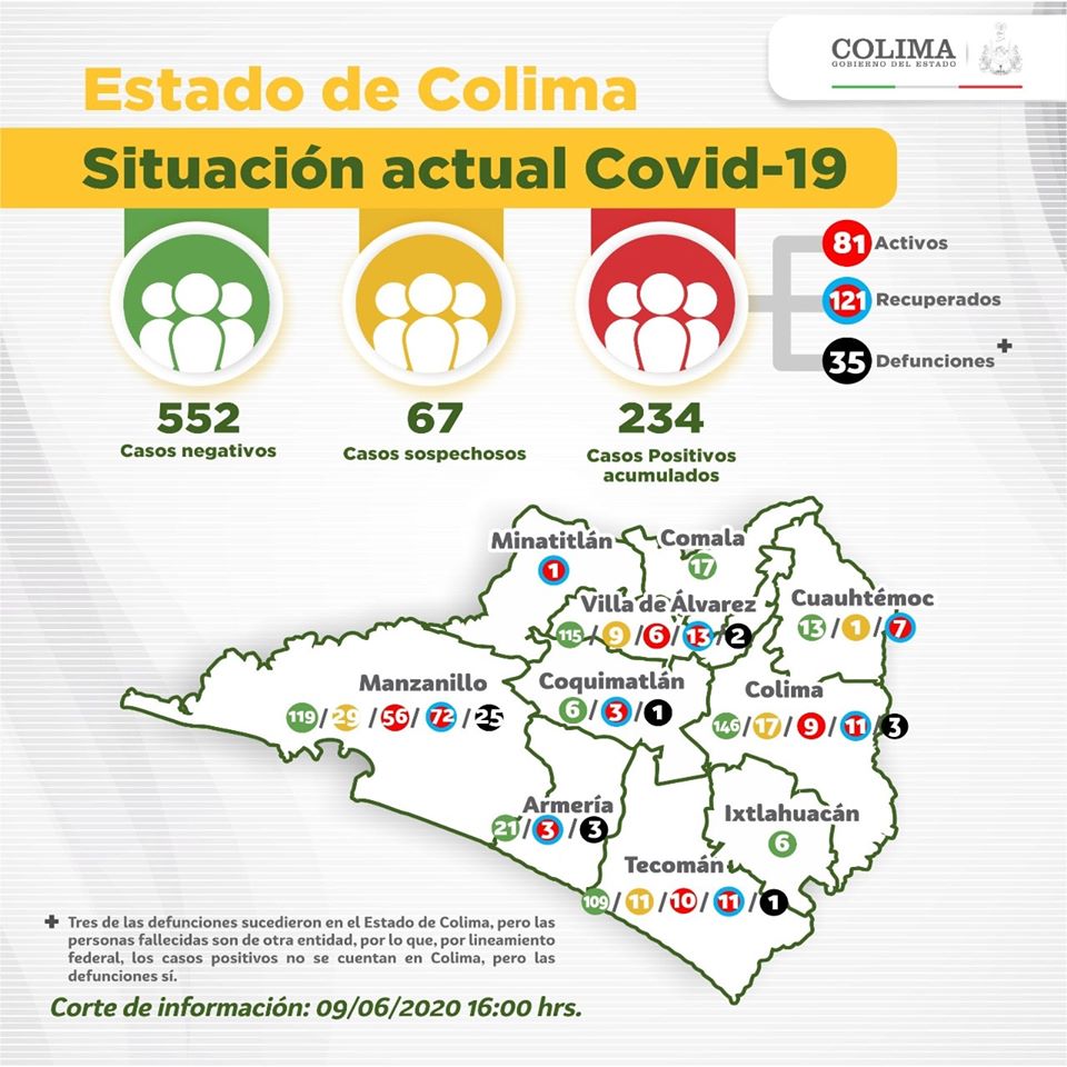 Colima, México, Comunicado (10/06/2020).- El último reporte de las instituciones del Sector Salud señala que hubo 2 defunciones y 14 nuevos casos positivos al virus del...