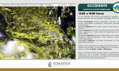 Colima, México, Avanzada (12/09/2025).- La Comisión Nacional del Agua (CONAGUA) advirtió que en las próximas horas se presentarán chubascos con lluvias puntuales fuertes acompañadas de descargas...