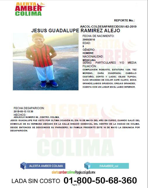 Colima, México, Avanzada (16/05/2019).- Activan Alerta Amber para localizar a Jesús Guadalupe Ramírez Alejo, el menor tiene 8 años d edad y desapareció el 13 de...