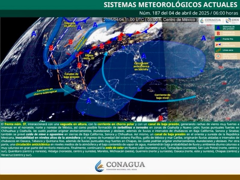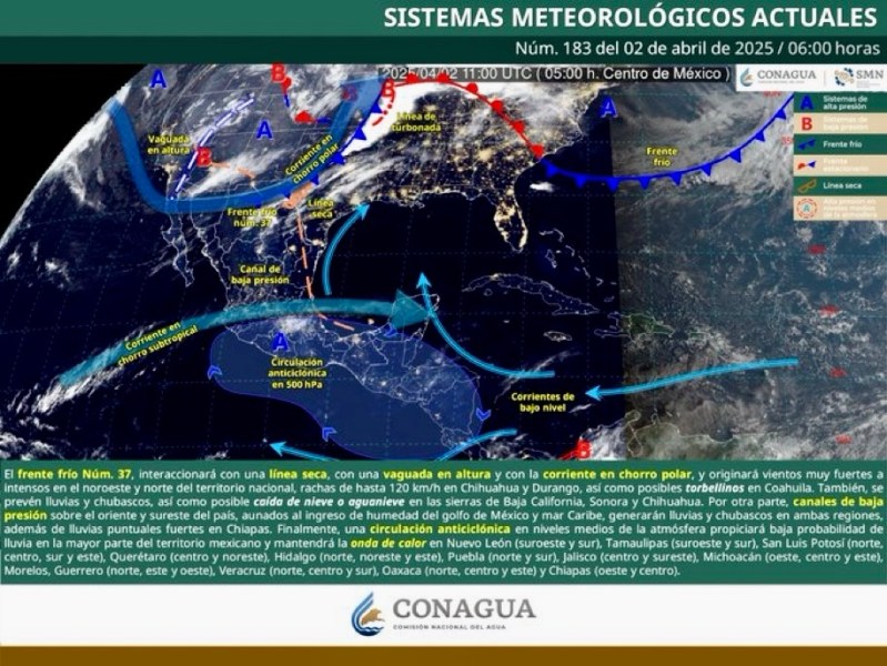 Colima, México, Avanzada (02/04/2025).- Durante este día, una circulación anticiclónica en niveles medios de la atmósfera mantendrá baja probabilidad de lluvia en gran parte del país...