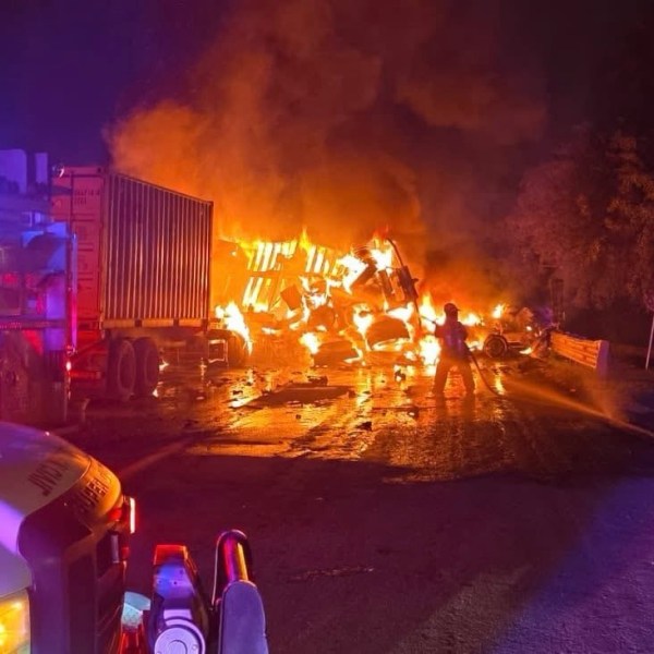 Colima, México, Avanzada (19/11/2025).- Personal de Protección Civil y Bomberos de Cuauhtémoc atendió esta madrugada el reporte del incendio de un tráiler en el kilómetro 136+500...
