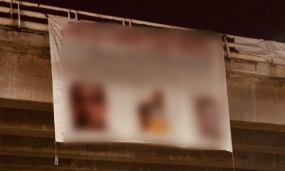Colima, México, Avanzada (1/9/2025).- La mañana de este lunes, alrededor de las 7:00 horas, apareció colgada una narcolona de gran tamaño en el puente a desnivel...