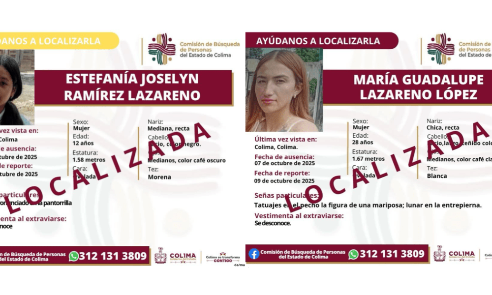 Colima, México, Avanzada (11/10/2025).- La Comisión de Búsqueda de Personas del Estado de Colima informó que María y Estefanía, madre e hija reportadas como desaparecidas el...