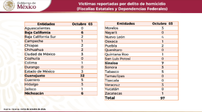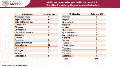 Colima, México, Avanzada (04/10/2024).- La Secretaría de Seguridad y Protección Ciudadana informó que se registraron 97 homicidios dolosos en todo el país durante la jornada de...