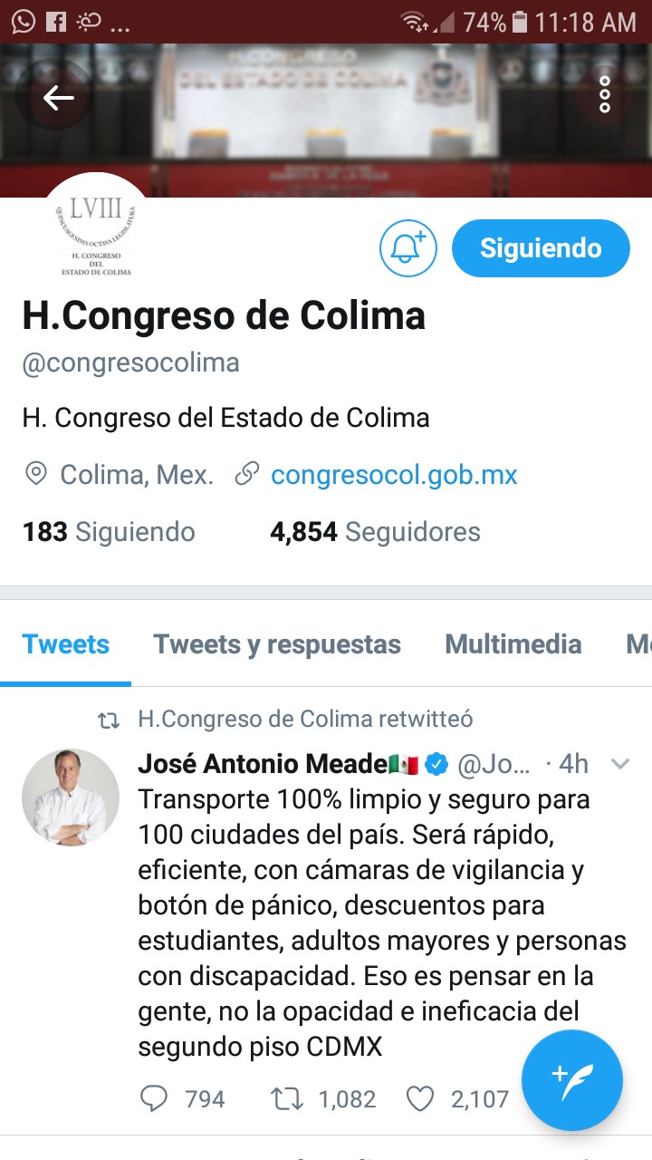 Colima, México, Avanzada (02/05/2018).- La cuenta oficial de twitter del Congreso de Colima retuiteó un mensaje del candidato presidencial de la coalición “Todos por México”, José...