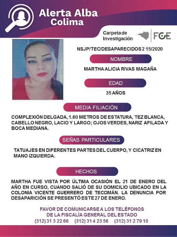 Martha Alicia Rivas Magaña fue vista por última vez el 21 de enero del año en curso, cuando salió de su domicilio ubicado en la colonia Vicente Guerrero de Tecomán. La denuncia por desaparición se presentó este 27 de enero.