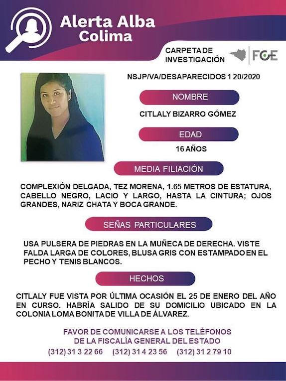 Citlaly Bizarro Gómez fue vista por última ocasión el 25 de enero del año en curso. Habría salido de su domicilio ubicado en la colonia Loma Bonita de Villa de Álvarez.