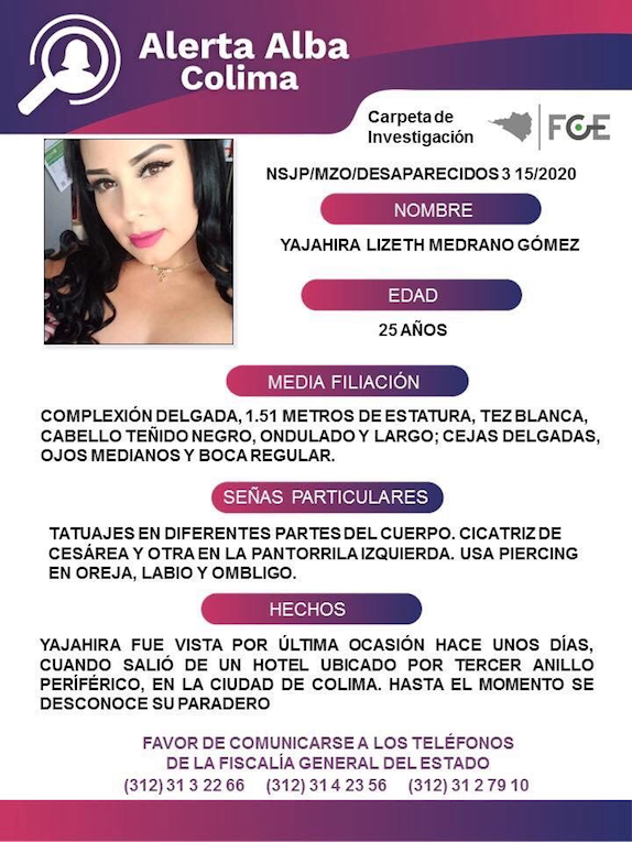 Yajahira Lizeth Medrano Gómez fue vista por última vez hace unos días cuando salió de un hotel ubicado por Tercer Anillo Periférico, en la ciudad de Colima. Hasta el momento se desconoce su paradero.