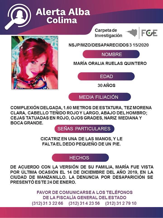 María Oralia Ruelas Quintero fue vista por última ocasión el 14 de diciembre del año 2019, en la ciudad de Manzanillo. La denuncia por desaparición se presentó este 24 de enero.