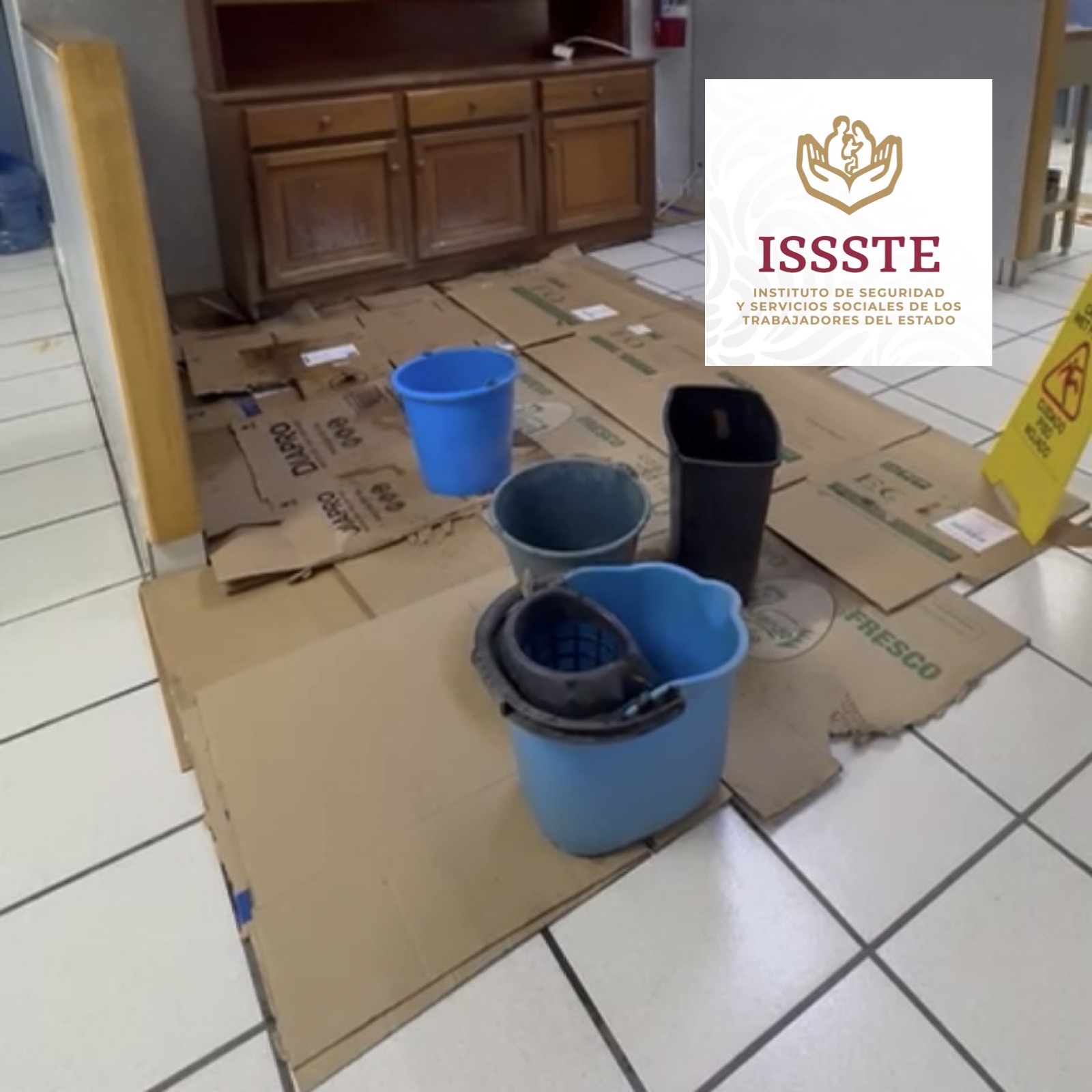 Indicó que consultorios, pasillos, áreas al frente de la dirección, sanitarios y quirófanos “se observan con cartones, botes y cubetas en el piso, para juntar el agua de las más de 50 goteras que están por todas partes: el problema no es menor, los pisos húmedos por el agua de las goteras son un peligro para los derechohabientes que todos los días van a consulta; para los doctores, enfermeras y el personal administrativo y manual que labora en el instituto; los doctores que están en los consultorios dañados están expuestos a que plafones húmedos les caigan en la cabeza o dañen los pocos aparatos que tienen”.