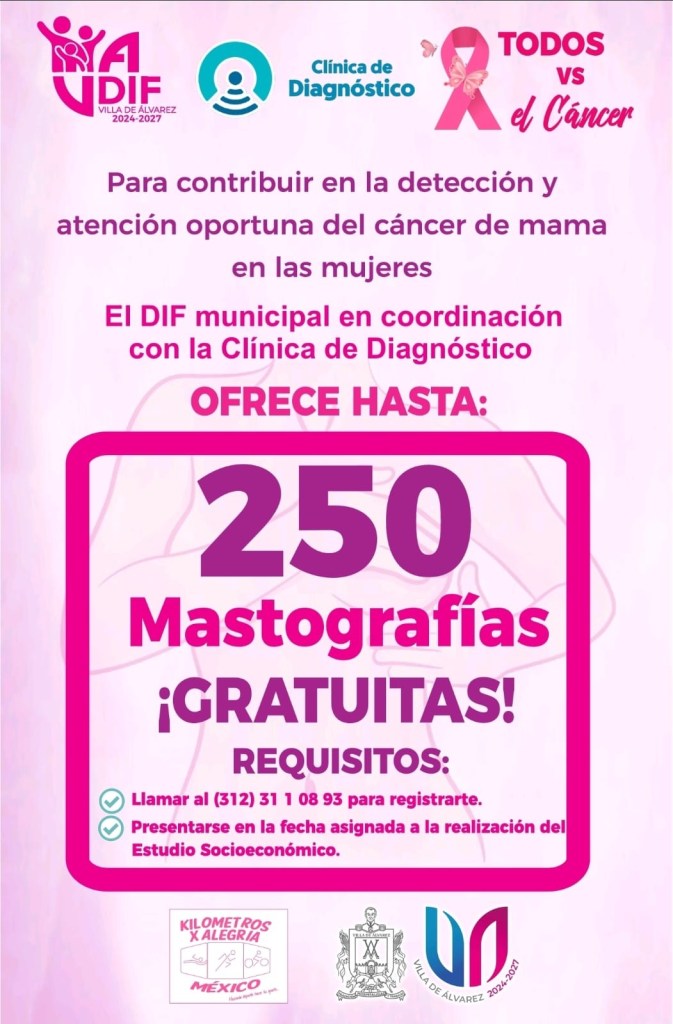 A través de un video difundido en su página de Facebook, la Alcaldesa presentó el programa de actividades de su gobierno para octubre, mes dedicado a la lucha contra el cáncer de mama, entre las que destacan las 250 mastografías, que se realizarán en coordinación con el DIF Municipal de Villa de Álvarez y la Clínica de Diagnóstico, de Carlos Juárez y Dalia Santana.