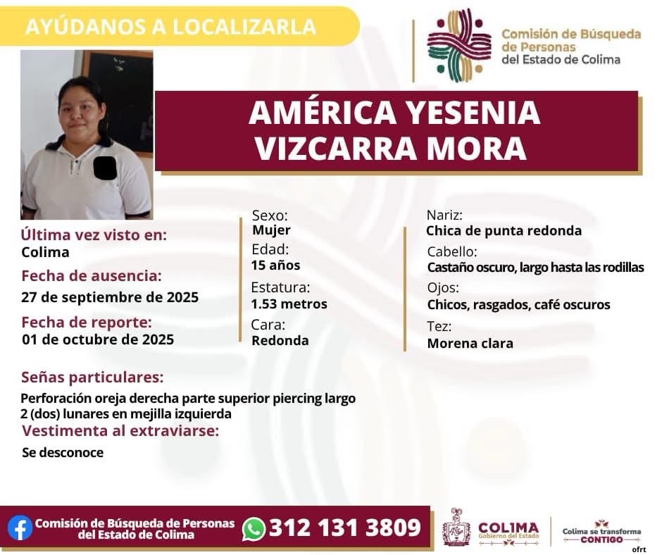 Colima, México, Avanzada (02/10/2025).- La Comisión de Búsqueda de Personas del Estado de Colima emitió un reporte para localizar a América Yesenia Vizcarra Mora, de 15 años de edad, quien fue vista por última vez en el municipio de Colima el pasado 27 de septiembre de 2025. La desaparición fue reportada oficialmente el 1 de octubre.