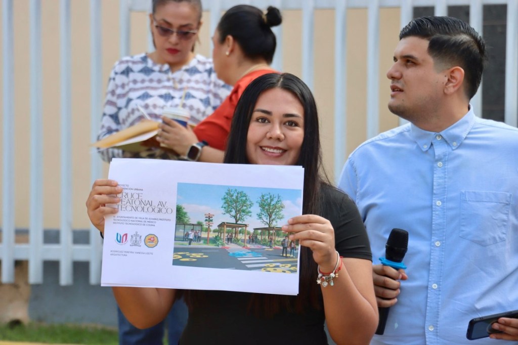 Presentaron alumnos y alumnas de Arquitectura trabajos de intervención urbana Villa de Álvarez, Colima, Comunicado (02/10/2025).- La Presidenta Tey Gutiérrez Andrade reconoció a estudiantes del séptimo semestre de la carrera de Arquitectura del Tecnológico Nacional de México Campus Colima, por los proyectos de intervención urbana en el cruce peatonal de la Avenida Tecnológico, desde la parada del transporte público hasta el ingreso principal del plantel. Las alumnas y alumnos que presentaron proyectos y fueron reconocidos son Vanessa Lizeth Rodríguez, Natalia Zúñiga, Aldo Vázquez Mendoza, Susana Moramay Velázquez, Emily Gabriela Chávez, César Jael Osorio, Cecilia Gabriela Áviña, Lexa Estrada y Jesús Eduardo López, quienes explicaron sus planes para mejorar el cruce peatonal por el que caminan diariamente cientos de alumnos. La Alcaldesa Tey Gutiérrez consideró exitoso el ejercicio de vinculación académica, “en cuya estrecha colaboración fortalecemos la atención de necesidades y problemas de nuestro entorno; al tiempo de reforzar la formación de estudiantes y la transmisión de conocimientos”. Apuntó que la intervención de urbanismo táctico para mejorar la movilidad en el municipio presentada por estudiantes, genera espacios urbanos más accesibles, inclusivos y atractivos, con un decidido impulso a la apropiación social del espacio público. Dijo que con interacciones como la hecha por los estudiantes de Arquitectura, Villa de Álvarez avanza y se fortalece, porque son esas acciones las que ejercen un impacto directo y positivo en la manera en cómo vive la sociedad, mejorando la calidad de vida a través del diseño. Hugo Ernesto Cuéllar, Director del Tecnológico Nacional de México Campus Colima, tras reconocer la participación de las alumnas y alumnos, agradeció a Tey Gutiérrez por considerar a la institución educativa como su aliada en el trabajo en la educación. Álvaro Mata Rodríguez, de la Cámara Mexicana de la Industria de la Construcción en Colima, recordó que en torno al Tecnológico Nacional de México Campus Colima, el Gobierno de Villa de Álvarez construyó un paradero de transporte urbano y mejoró el eje de movilidad compuesto por las avenidas María Ahumada de Gómez y Avenida Tecnológico, arteria vial de 3.1 kilómetros que fue repavimentada. El dirigente empresarial expresó el interés de la CMIC Colima para sumarse al esfuerzo del Ayuntamiento de Villa de Álvarez de hacer posible alguno de los proyectos presentados por las alumnas y alumnos del séptimo semestre de la carrera de Arquitectura, para mejorar la seguridad de peatones y transformar el entorno con un poco de intervención urbana. Gretel Escoto Aranda, catedrática de Arquitectura, reconoció el vínculo con el Ayuntamiento de Villa de Álvarez y el Tec de Colima y explicó que el proyecto de intervención urbana en el cruce peatonal en Avenida Tecnológico contiene propuestas de urbanismo táctico con intención de lograr una identidad y dejar huella en el plantel.