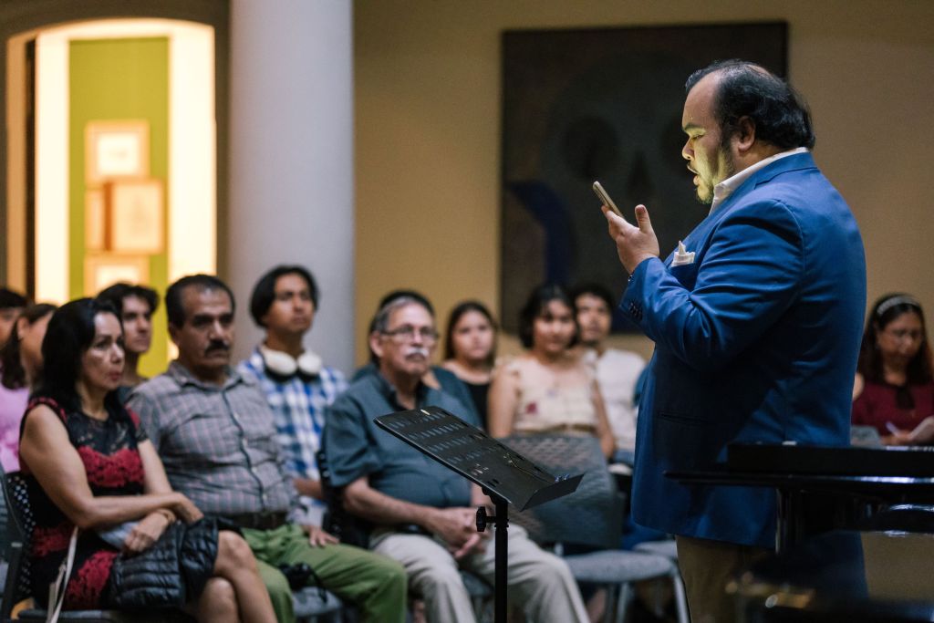 José Valdepeña, acompañado en el piano por Mario García, explicó al público los antecedentes de la música que interpreta, iniciando desde los griegos, quienes crearon el teatro como forma de concentrar a muchas personas en un espacio para disfrutar de acto público, “y fue así como nació también el canto en el teatro”.