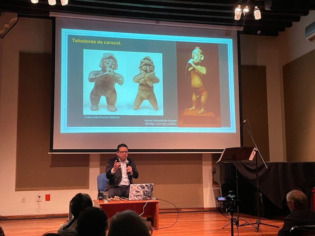 Colima, México, Comunicado (04/10/2025).- Con la finalidad de presentar los hallazgos de sus más recientes investigaciones, el universitario y etnomusicólogo, Abraham Elías López, ofreció en fechas recientes la conferencia “El sonido primigenio de los aerófonos múltiples de Colima: una comparación con el estridular de las chicharras”, en la Fonoteca Nacional de la Ciudad de México.