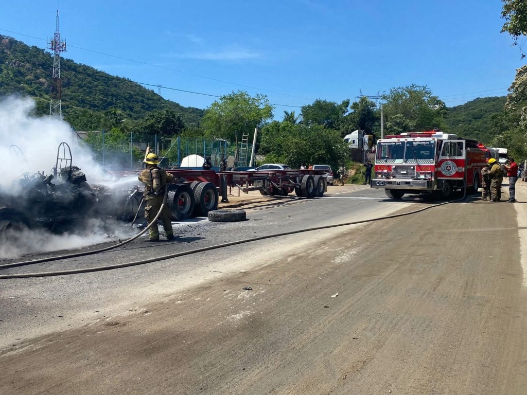 Colima, México, Avanzada (13/10/2025).- Personal operativo de la Dirección de Protección Civil y Bomberos de Manzanillo atendió este lunes el reporte de un incendio que consumió un tractocamión en la comunidad de El Colomo, sobre el libramiento, a la altura del OXXO de Colomos.