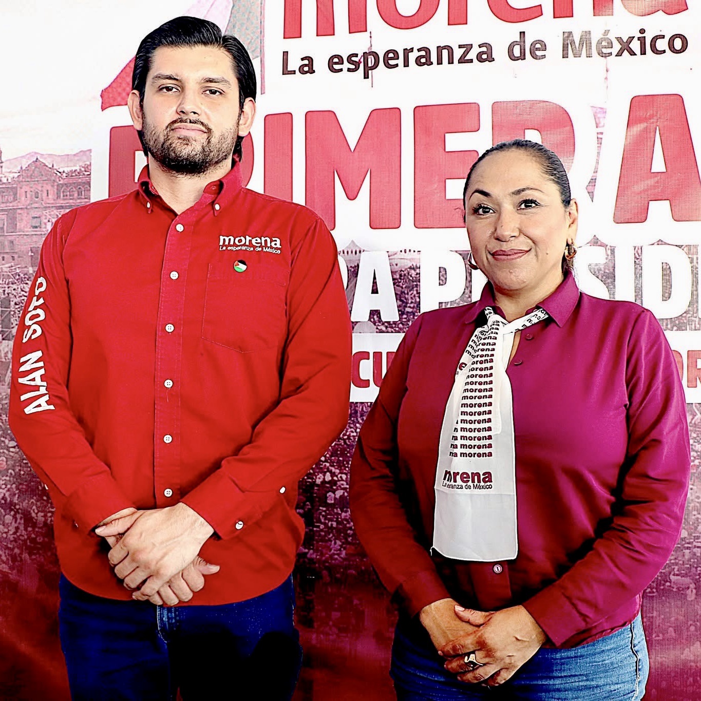 El secretario de organización de Morena y su presidenta, Alan Soto y Mitzuko Márquez, respectivamente.