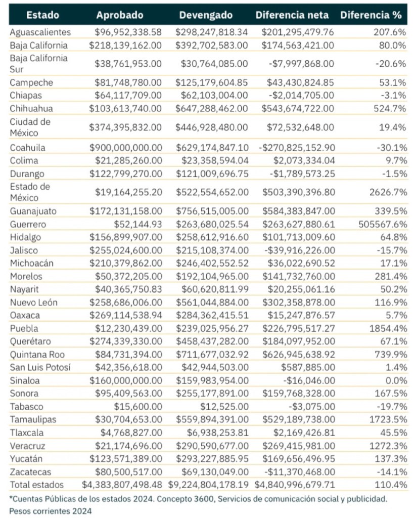 Según el documento, mientras el gobierno federal redujo su gasto en publicidad oficial en un 11.3%, varios estados incrementaron notablemente su inversión en este rubro: Guerrero, Estado de México, Puebla, Tamaulipas y Veracruz gastaron más de diez veces lo aprobado por sus respectivos congresos locales.