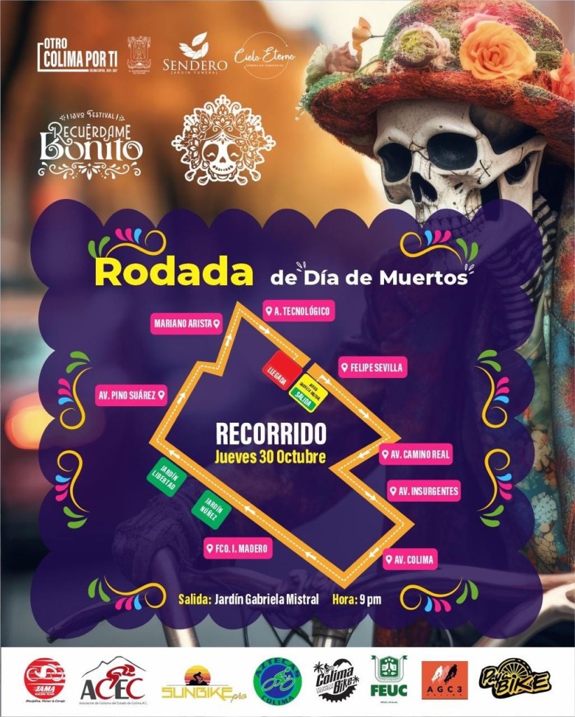 Este mismo jueves 30 de octubre, pero a partir de las 21:00 horas, se realizará la Rodada por el Día de Muertos, la cual está pensada para ciclistas y público en general, misma que partirá del jardín Gabriela Mistral, a la que se está invitando a las familias a que acudan con sus bicicletas a participar en esta actividad, solicitándoles solamente que acudan tomando las debidas medidas de seguridad.