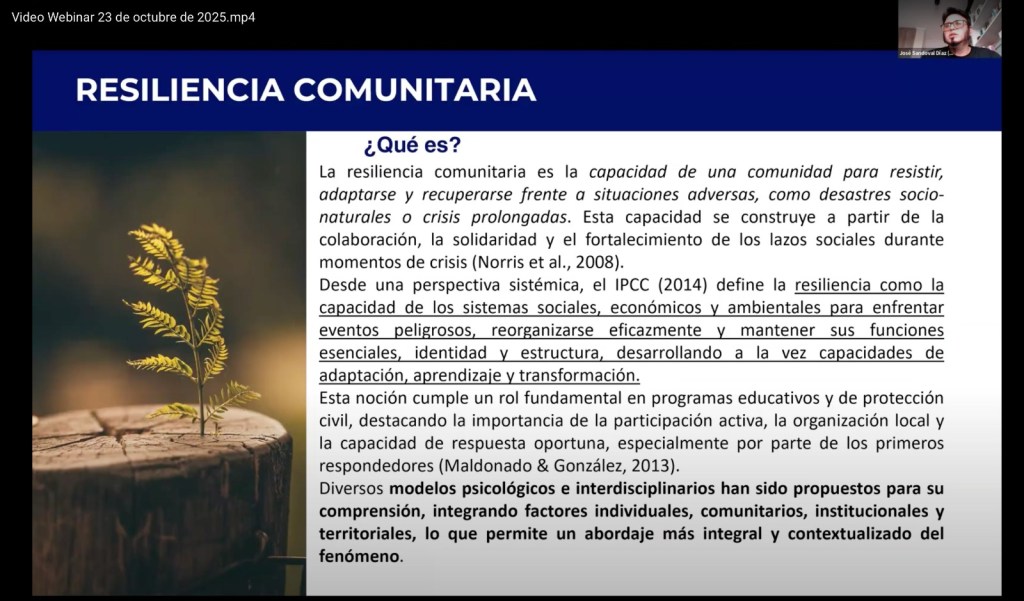 Como parte del programa conmemorativo, se impartió el webinar “Co-construcción de la resiliencia comunitaria frente al riesgo de desastres a través de metodologías participativas”, a cargo del Dr. José Sandoval Díaz, director del Centro de Estudios Ñuble de la Universidad del Biobío, en Chile.