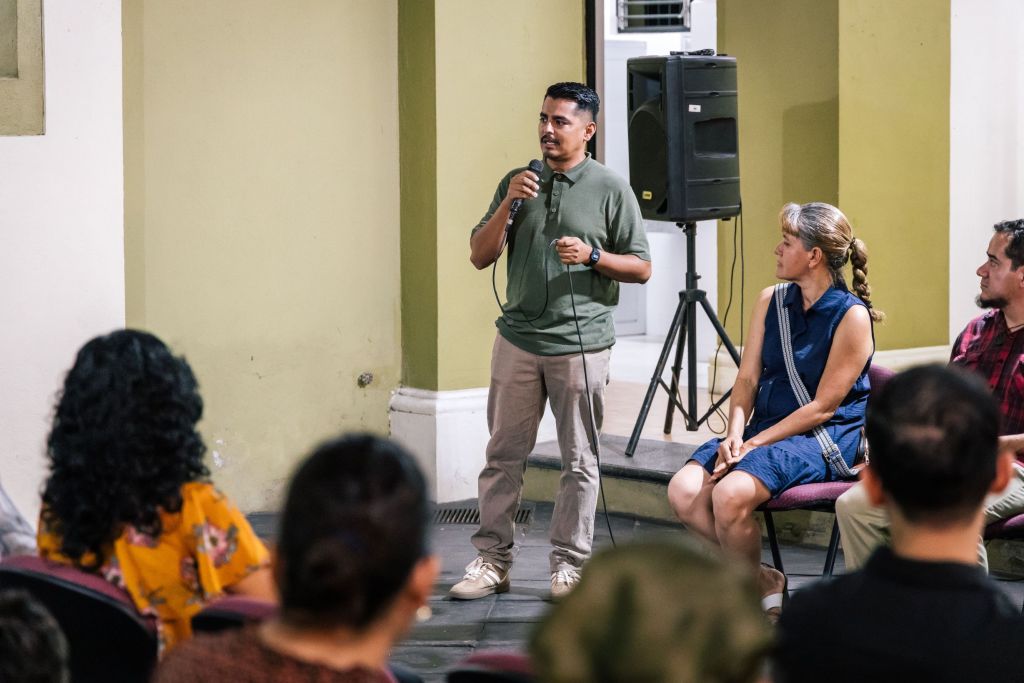 Por otra parte, reconoció la presencia del maestro Alberto Alvarado, quien ha sido formador de incontables generaciones de artistas gráficos que, al igual que “Areck”, “se han ido desarrollando bajo su guía e impulso”. Y agregó: “Reconocemos el gesto del maestro Beto Alvarado al estar aquí esta noche apadrinando al joven expositor, así como su labor incansable impulsando expresiones artísticas de nuestro estado a través de su taller y de colectivos de gráfica colimense”.