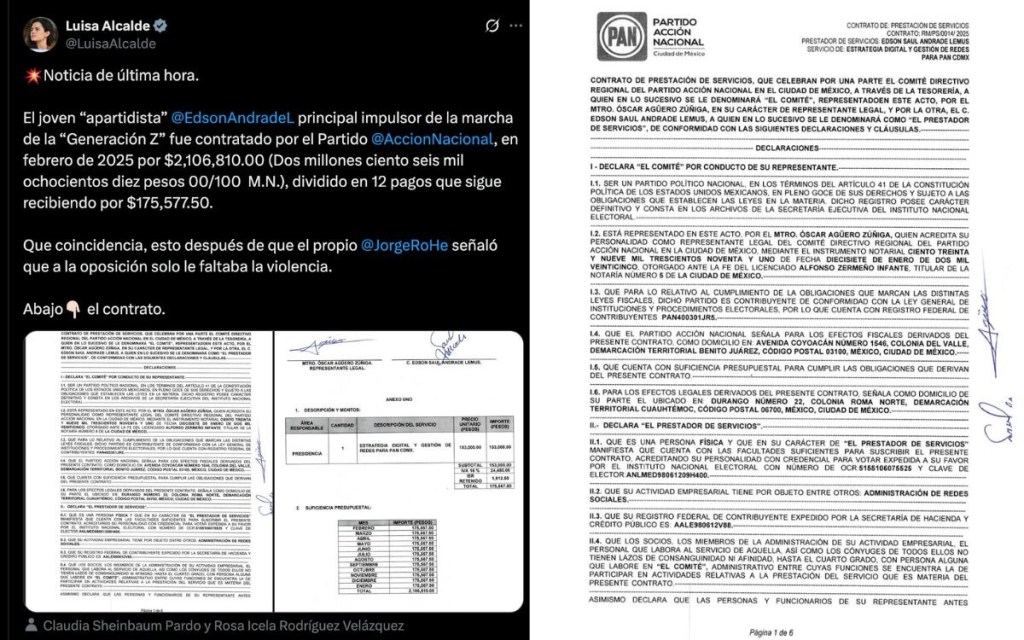 Ciudad de México, Avanzada (20/11/2025).- La presidenta nacional de Morena, Luisa María Alcalde Luján, hizo públicos este martes una serie de documentos que, según afirmó, confirman un contrato entre el Partido Acción Nacional (PAN) y Edson Saúl, joven creador de contenido señalado como uno de los promotores de la movilización de la llamada “Generación Z”.