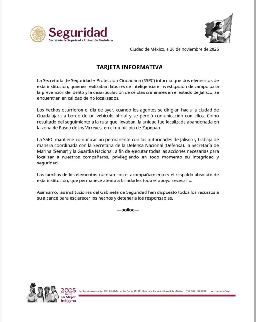Jalisco, México, Avanzada (26/11/2025).- Dos elementos de la Secretaría de Seguridad y Protección Ciudadana (SSPC) desaparecieron en Zapopan, Jalisco, mientras realizaban tareas de inteligencia y trabajo de campo. La dependencia confirmó que ambos agentes están en calidad de no localizados.