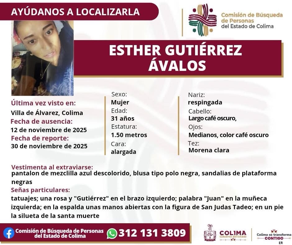 Colima, México, Avanzada (01/12/2025).- La Comisión de Búsqueda de Personas del Estado de Colima emitió una ficha para localizar a Esther Gutiérrez Ávalos, mujer de 31 años que fue vista por última vez el 12 de noviembre de 2025 en el municipio de Villa de Álvarez. Su ausencia fue reportada oficialmente el 30 de noviembre, casi tres semanas después de que se perdiera contacto con ella.