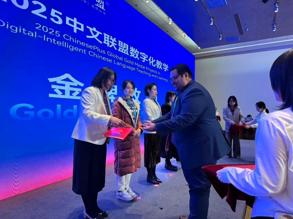 Aaron Radillo informó que este mes noviembre participó en la World Chinese Language Conference, organizada por la Alianza Global del Idioma Chino y Continental Han Feng Network Technology (Beijing) Co., Ltd., donde la institución recibió el premio Socio de Medalla de Oro por su destacada implementación del programa.