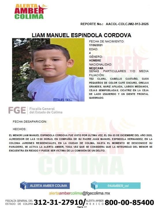 Colima, México, Avanzada (03/12/2025).- La Fiscalía General del Estado activó esta tarde la Alerta Amber para localizar al menor Liam Manuel Espín­dola Córdova, de 4 años de edad, visto por última vez este miércoles, alrededor de las 13:00 horas en la colonia Jardines Residenciales, en la ciudad de Colima.