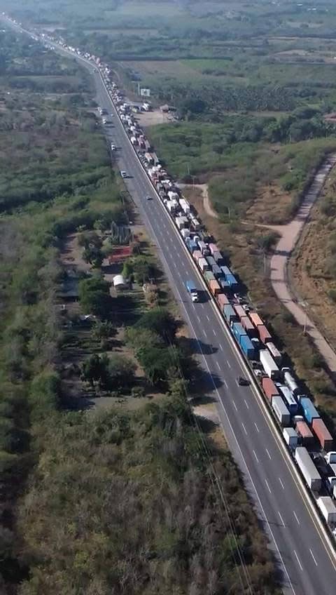 A media tarde, los conductores ya hablaban de pérdidas económicas: mercancía rezagada, cadenas logísticas rotas, horas laborales desperdiciadas y un desgaste físico evidente tras pasar medio día atrapados. La carretera no avanzaba ni retrocedía; simplemente permanecía. La fila interminable se convirtió en salón de espera improvisado, comedor, oficina móvil y refugio involuntario bajo el sol ardiente. Varios bajaron de sus unidades para estirar las piernas, otros se sentaron en el pavimento, algunos más compartieron agua o frustración.