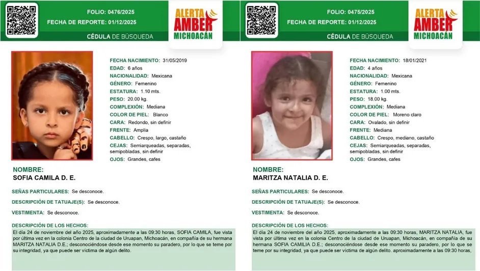 Michoacán, México, Avanzada (05/12/2025).- La desaparición de dos niñas de 4 y 6 años mantiene en zozobra a Uruapan, Michoacán, luego de que su madre, Maritza Espino, fuera localizada sin vida el pasado fin de semana. Las pequeñas, identificadas como Sofía Camila y Natalia, están desaparecidas desde el 24 de noviembre, fecha en la que también se dejó de saber de la joven madre de 28 años.
