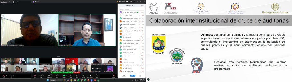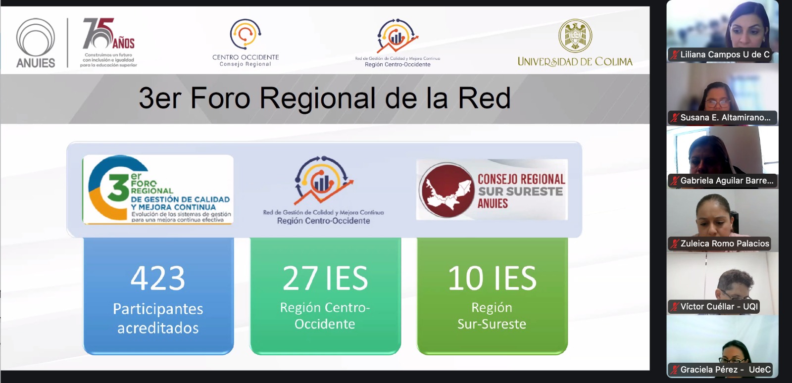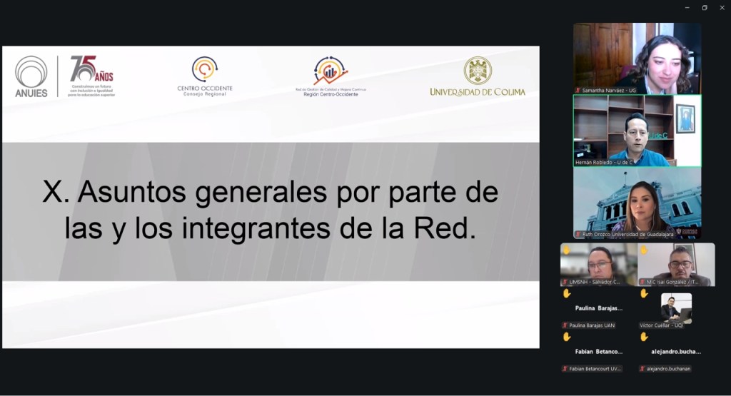 Colima, México, Comunicado (06/12/2025).- De manera virtual, la Red de Gestión de Calidad y Mejora Continua de la Asociación Nacional de Universidades e Instituciones de Educación Superior (ANUIES) de la Región Centro Occidente, realizó con éxito su Décima Reunión Ordinaria, en la cual se presentaron las acciones y resultados alcanzados durante el año.