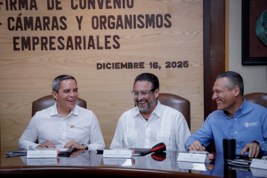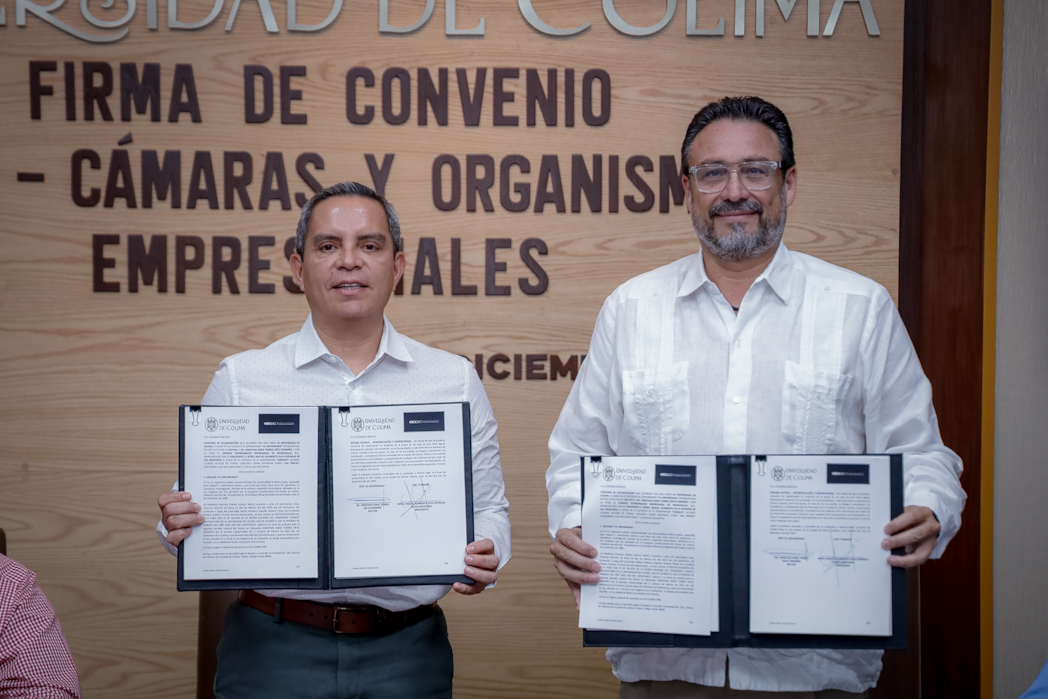 Colima, México, Comunicado (16/12/2025).- Este martes, como parte de una jornada amplia y significativa de trabajo institucional, la Universidad de Colima, encabezada por su rector, Christian Jorge Torres Ortiz Zermeño, refrendó alianzas y compromisos con cámaras y organismos empresariales del estado. En actos por separado, la institución firmó convenios de colaboración con Gabriela Elena Gómez Brun, presidenta de la Cámara Nacional de Comercio, Servicios y Turismo de Colima (CANACO), y con Miguel Silva Espinoza de los Monteros, presidente del Consejo de Cámaras Empresariales del Estado de Colima (CCECM), dos organismos clave del sector productivo colimense.