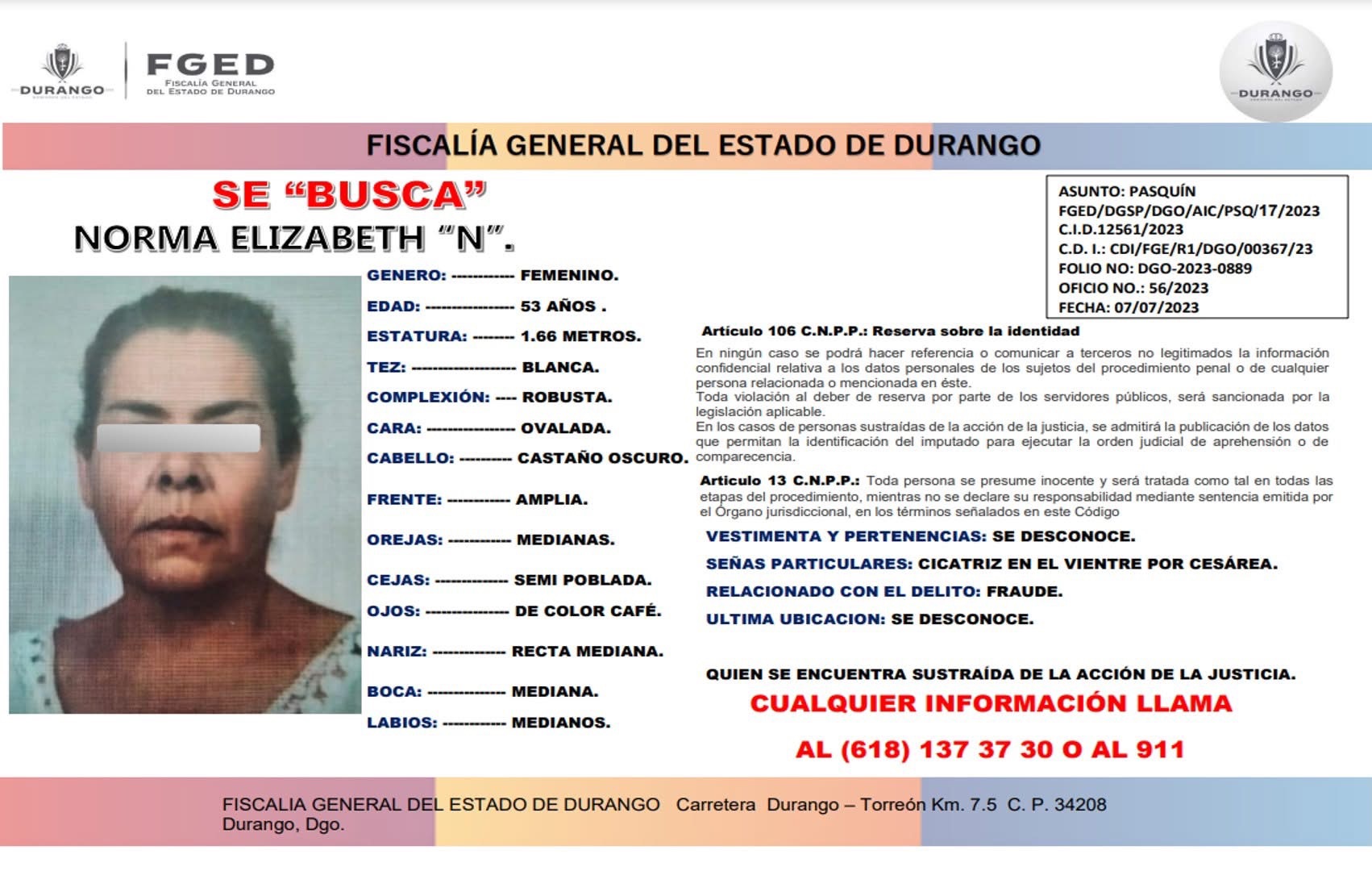 México, Avanzada (19/12/2025).- La Fiscalía General del Estado de Durango solicitó la colaboración de la ciudadanía para localizar a Norma Elizabeth “N”, quien se encuentra sustraída de la acción de la justicia y es requerida por su presunta responsabilidad en el delito de fraude, relacionado con la venta ilegal de terrenos.