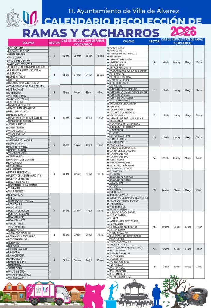‎Villa de Álvarez, Colima, Comunicado (03/01/2026).- La Presidenta de Villa de Álvarez, Tey Gutiérrez Andrade, dio a conocer el Calendario de Recolección de Ramas y Cacharros para este 2026, con el que se atenderán todas las colonias del municipio, a las que se pasará cuatro veces durante el año por cada una de ellas.